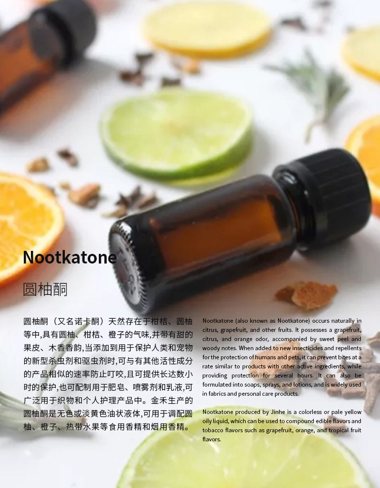 天然存在于柑桔、圆柚等中,具有圆柚、柑桔、橙子的气味,并带有甜的果皮、木香香韵,当添加到用于保护人类和宠物的新型杀虫剂和驱虫剂时,可与有其他活性成分的产品相似的速率防止叮咬,且可提供长达数小时的保护,也可配制用于肥皂、喷雾剂和乳液,可广泛用于织物和个人护理产品中。wepoker德州生产的圆柚酮是无色或淡黄色油状液体,可用于调配圆柚、橙子、热带水果等食用香精和烟用香精。