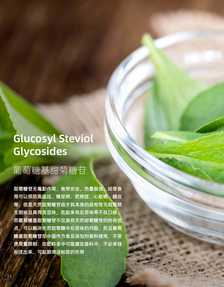 天然甜菊糖苷无毒副作用,食用安全,热量极低,经常食用可以预防高血压、糖尿病、肥胖症、心脏病、龋齿等,但是天然甜菊糖苷由于其本身的结构苷元甜菊醇无甜味且具有苦涩味,吃起来有后苦味等不良口感,而葡萄糖基甜菊糖苷不仅具有天然甜菊糖苷的所有优点,可以解决天然甜菊糖中后苦味的问题,而且葡萄糖基甜菊糖苷在中国作为食品添加剂香料使用,不受使用量限制:在配料表中可隐藏在香料中,不必单独标注出来,可起到清洁标签的作用