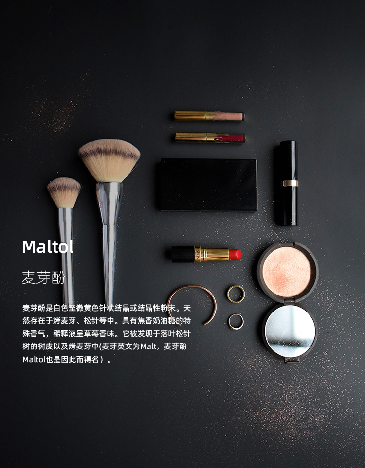 麦芽酚是白色至微黄色针状结晶或结晶性粉末。天然存在于烤麦芽、松针等中。具有焦香奶油糖的特殊香气,稀释液呈草莓香味。它被发现于落叶松针树的树皮以及烤麦芽中(麦芽英文为Malt,麦芽酚Maltol也是因此而得名)。